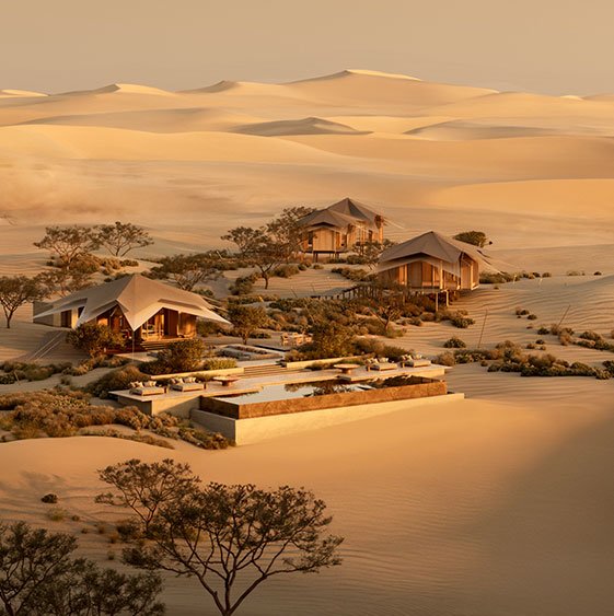 Previsto para abrir no segundo semestre de 2026, o The Malkai propõe uma experiência de glamping de alto padrão no deserto de Omã. A arquitetura se inspira em tendas tradicionais da região, reinterpretadas com linguagem contemporânea e soluções construtivas leves. Os espaços são desenhados para se integrar à paisagem, com foco em vistas amplas e conexão com o ambiente natural. A proposta combina conforto, identidade local e uma leitura atual da hospitalidade no deserto.