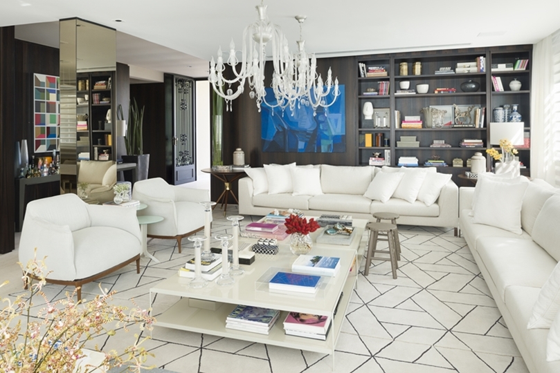 Ponto alto do décor, o projeto foi totalmente abraçado pela marcenaria. Desde os armários, às portas Trepiu, que se camuflam nas paredes, e a imponente presença do Ébano de Macassar, que é uma madeira nobre e de origem africana. A ambientação ganha charme e requinte com telas de Abraham Palatnik, Burle Marx e uma série de artistas contemporâneos da Bahia e de São Paulo, que fazem uma conexão das raízes da família com a nova morada.