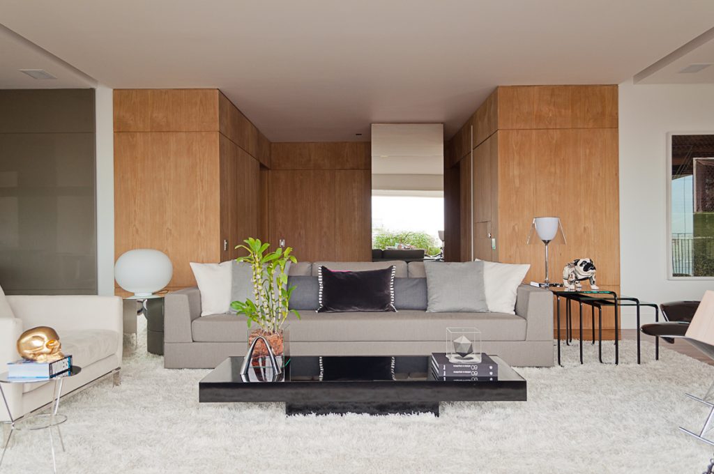 Nesse apartamento, o arquiteto Toninho Noronha escolheu um tapete mais peludo para levar calor ao piso do living.