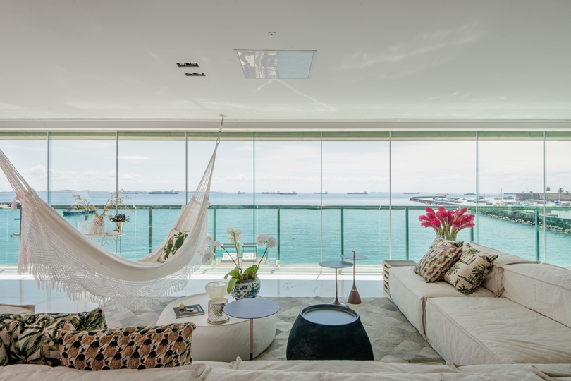 Símbolo nordestino e muito comum nas casas baianas, a rede é o destaque deste apartamento reformado por Marcos Rolim e Camila Santiago, da Haifatto. A dupla instalou a peça comprada no Mercado Modelo, de Salvador, no centro do living, tirando partido da bela vista para o mar. De tecido cru, ela se integra à área social, marcada por uma decoração com elementos locais e pinceladas de azul. Devido à ausência de paredes para prender a rede, os profissionais a fixaram com uma estrutura de aço chumbada no teto e ganchos de rapel usados como extensores.