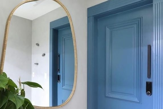 Para compor o hall social desse projeto, a arquiteta Duda Senna escolheu um super espelho com formato orgânico, que além de profundidade, serve também como uma peça de arte. A parede de cimento queimado forma a base neutra para explorar o destacado tom azul da porta.