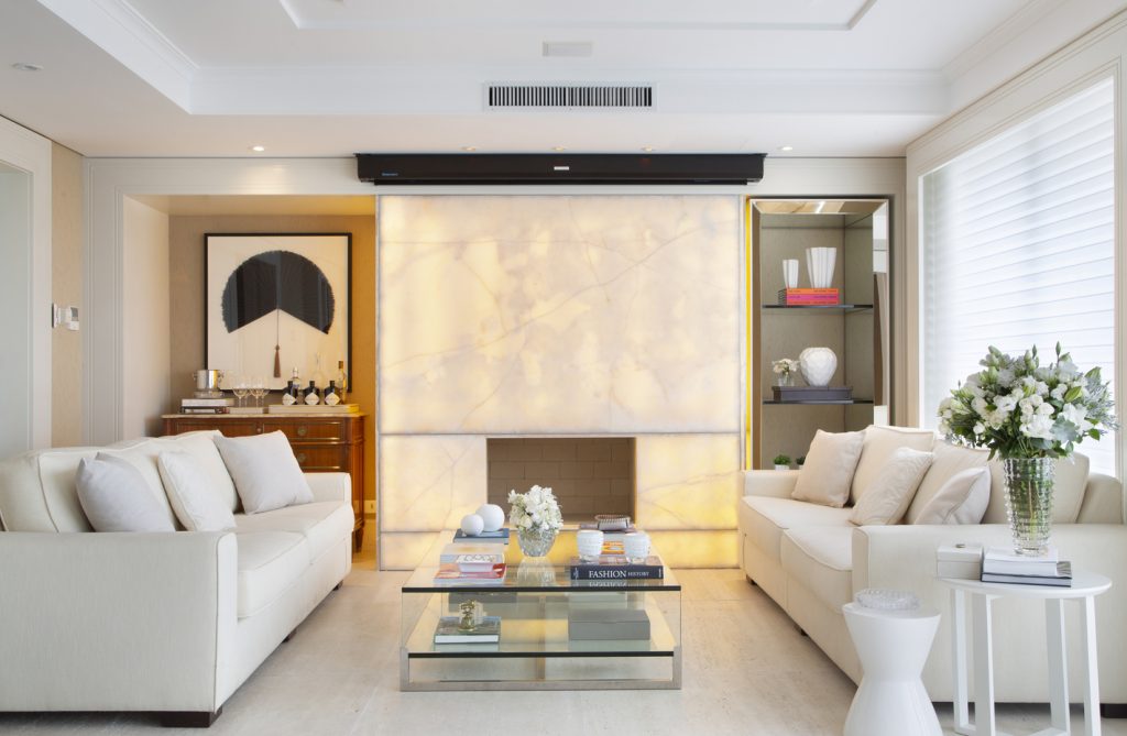 Todo em tons claros e neutros, o living tem com como destaque a parede em onix que reveste a lareira