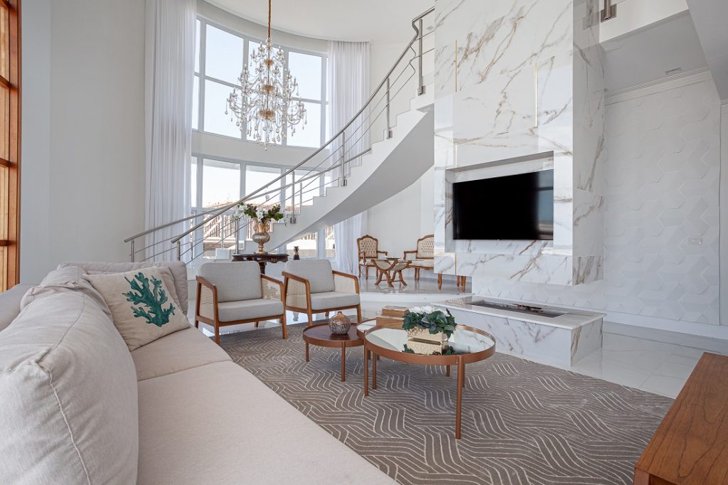 Em sua volta, o arquiteto assina a Sala Tempo. “O ambiente faz referência ao tempo que, com a pandemia, teve outro valor para as pessoas. É o tempo que elas têm para ficar com a família, para ler, estudar, trabalhar e tudo híbrido”, explica Dado.