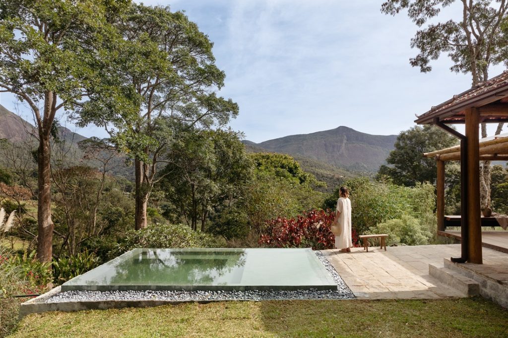 Da piscina, a vista para a vegetação e montanhas da serra fluminense é exuberante na casa de campo da arquiteta