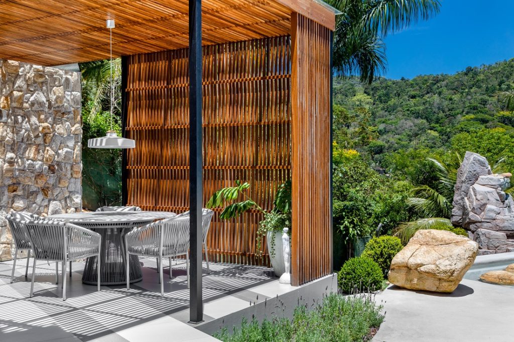 Extenso, o ambiente recebeu o pergolado com teto de vidro que protege do calor e da chuva e abriga a mesa de jantar com 14 lugares, desenhada por Ágata especialmente para essa família.