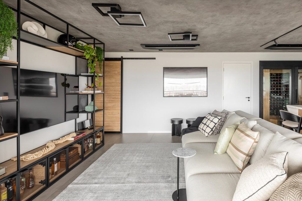 O emprego da madeira natural que participa, junto com a serralheria, do móvel destinado à TV, da porta que leva aos quartos e envolve a bancada da cozinha, é responsável por aquecer os ambientes, trazendo acolhimento. Na base neutra e atemporal da arquitetura, o cinza aparece no piso, no tapete e no efeito cimento queimado do teto e das paredes. Tudo é muito claro e a luz natural abundante vinda da varanda entra sem cerimônias, valorizando o layout fluido, que resulta em praticidade e, sobretudo, conforto e bem-estar.