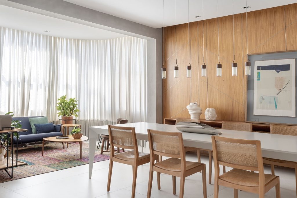 Na área de jantar, a arquiteta destaca o painel de madeira natural que reveste a parede ao fundo, com aplicação de frisos fininhos de aço que formam desenhos geométricos sutis.