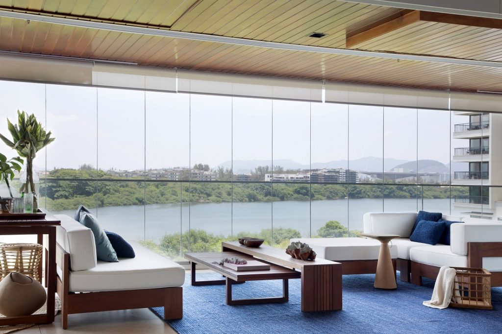 Após a execução do projeto final, a varanda principal passou a ter 20 metros lineares de cortina de vidro, que revelam 180 graus de vista da Lagoa de Marapendi, mais uma varanda de 14 metros lineares, a 45 graus, com vista da Praia da Reserva. “A vista é completamente livre de construções e, além da farta presença de céu e água, como o apartamento fica no terceiro andar, a sensação é de estar em contato direto com uma reserva ecológica de vegetação abundante”, diz Renata.