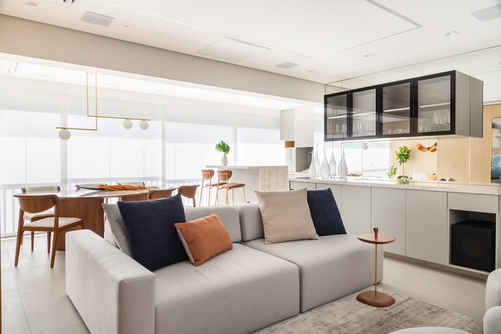 Com tons neutros e área social toda integrada, projeto otimizou os ambientes e trouxe um toque acolhedor para o lar da família