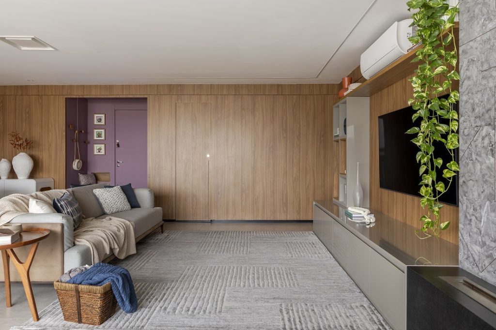 O projeto esbanjou paineis de madeira mais claros, que além de passarem uma sensação mais iluminada para o ambiente, transformam o living sem fugir da proposta praiana.