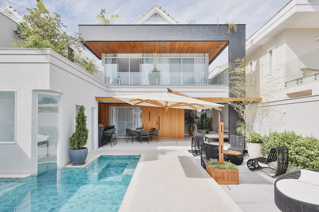 Para isso, amplas janelas e portas de vidro ganham destaque na fachada, conferindo iluminação, ventilação e amplitude, já que cria uma conexão visual entre as áreas interna e externa.