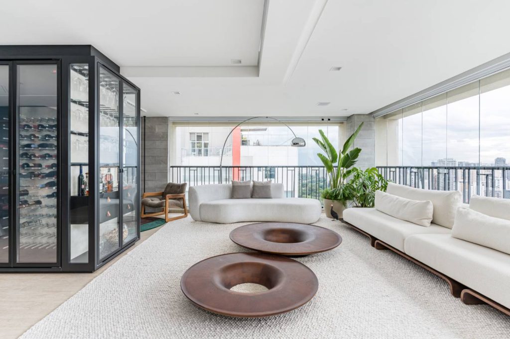 O fechamento de vidro, executado pela Europa Vision, ampliou a área de convivência. Com muitos espaços para receber, o living reúne peças de design assinado como as poltronas Mole, de Sergio Rodrigues, e Pitu, de Aristeu Pires, as mesas de centro Twist, de Jader Almeida, e o sofá Hiato, do Estúdio Ambos para a Full House | Foto: Kadu Lopes/Divulgação
