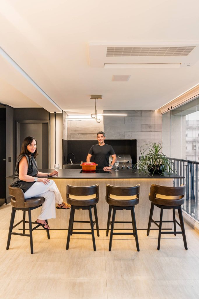A arquiteta Ana Rozenblit e o namorado Alexandre de Melo na área gourmet. Cosmopolita, o espaço tem bancada e frontão de granito São Gabriel escovado (Pedra Julia). As banquetas giratórias de couro, da Full House, completam o ambiente com elegância e conforto | Foto: Kadu Lopes/Divulgação
