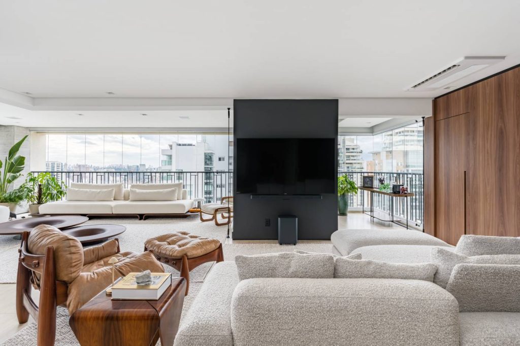 Pensado para receber filhos, amigos e família, o apartamento combina design brasileiro, arte e uma atmosfera calorosa. A integração entre sala e varanda se tornou o eixo condutor da proposta, resultando em um amplo espaço de 60 m² dedicado à convivência. O antigo pilar estrutural, antes obstáculo, foi transformado em uma elegante adega em U, hoje protagonista da área social.