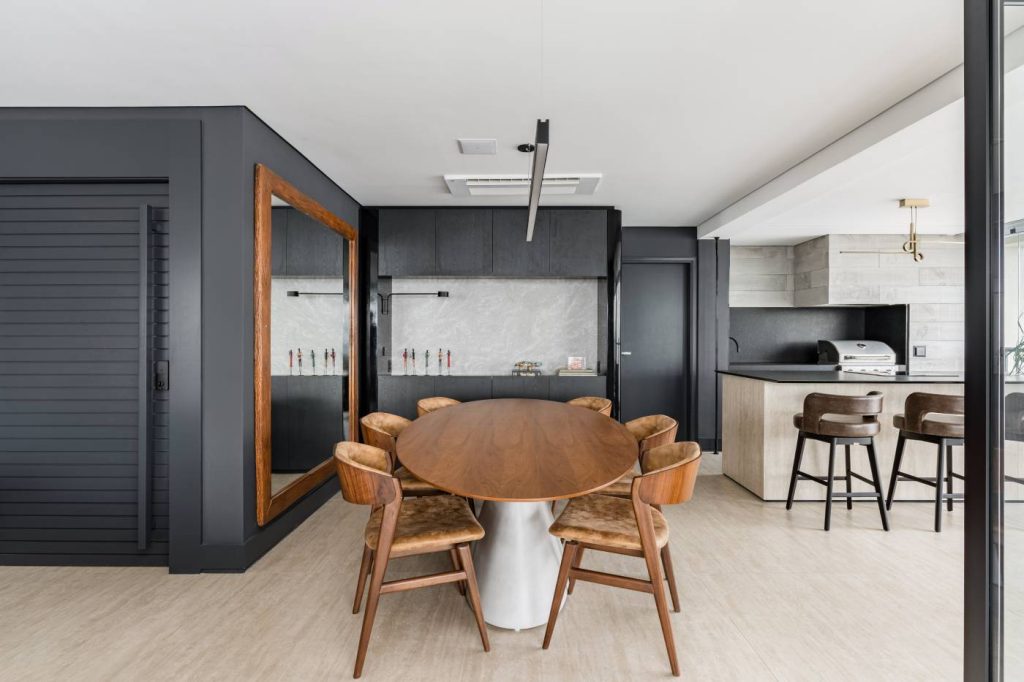 A escolha de materiais revela sofisticação equilibrada: tons de cinza, madeira natural e porcelanato que remete ao travertino criam uma base suave, contrastada por detalhes em preto que adicionam modernidade. Ícones do design nacional, como as poltronas Mole, de Sergio Rodrigues, e Pitu, de Aristeu Pires, e a mesa Pétala, de Jorge Zalszupin, convivem com peças mais contemporâneas, com as mesas Twist, de Jader Almeida, imprimindo movimento e dinamismo ao ambiente.