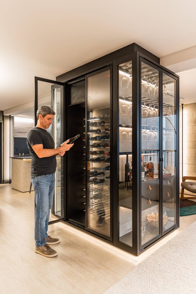 Adega em U transforma pilar estrutural em elemento protagonista e organiza a área social com elegância, integrando armazenamento e exposição de vinhos | Foto: Kadu Lopes/Divulgação