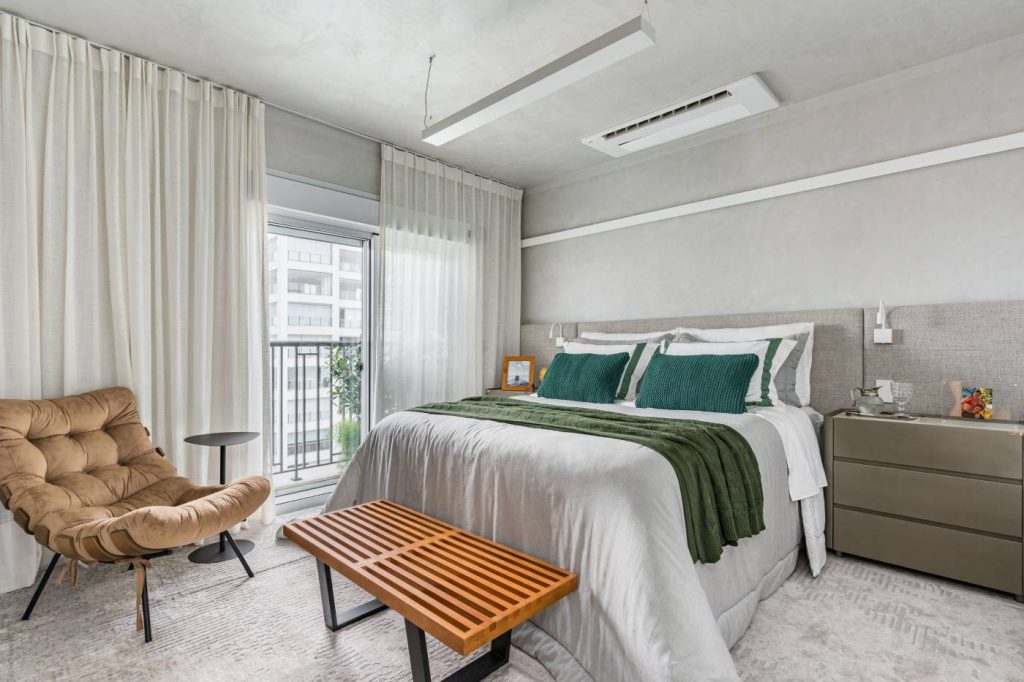 A suíte máster, que trocou a pintura pela textura efeito velvet nas paredes. A cabeceira estofada recebe arandelas, da Mais Led, próprias para leitura. Para filtrar a luz natural e trazer mais aconchego, o quarto ganhou cortinas Amorim, adquiridas na Ogden | Foto: Kadu Lopes/Divulgação