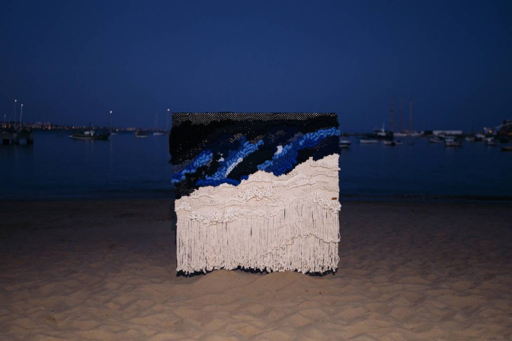 A obra têxtil propõe uma leitura sensível da paisagem, combinando diferentes técnicas e materiais. O contraste entre cores e texturas cria profundidade e movimento, evocando atmosferas noturnas.
