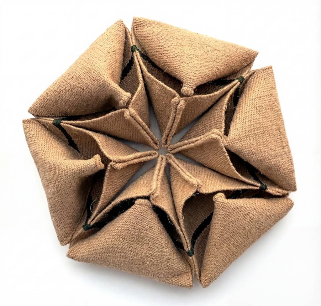 O objeto têxtil investiga estrutura e repetição, criando uma composição tridimensional. A peça articula técnica e experimentação, ampliando o campo do design têxtil.