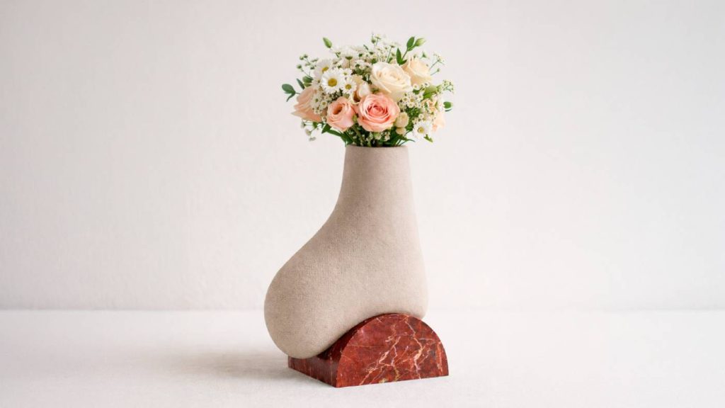 O vaso Fovere, de Victor M Leite, explora volumes orgânicos e uma leitura quase anatômica da forma. A peça combina base mineral com corpo texturizado, criando um contraste entre peso e delicadeza. O resultado é um objeto que se destaca tanto pela presença escultórica quanto pela relação tátil com o material.