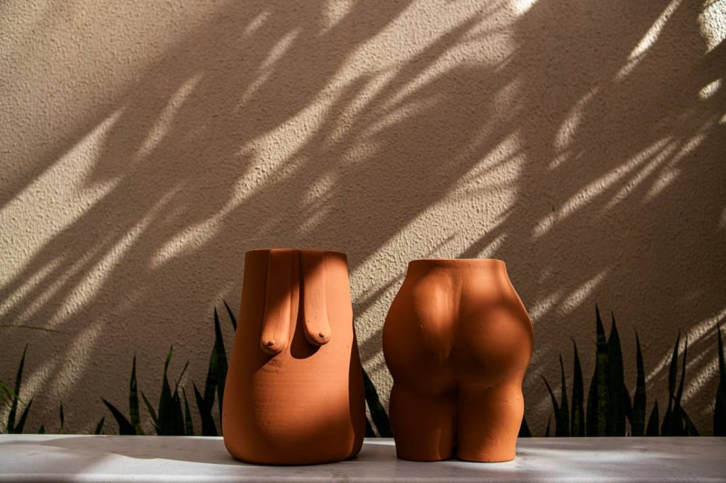 Os vasos apresentam formas orgânicas e acabamento artesanal, com forte presença matérico. As peças destacam a relação entre corpo, território e produção manual.