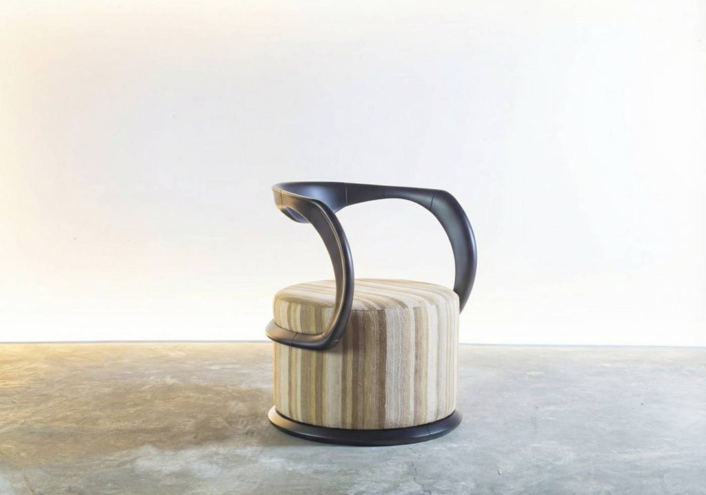 Pufftrona, criada por Rodolpho Guttierrez para a Boulle em parceria com a by Kamy, combina estrutura escultórica em madeira com revestimento têxtil | Foto: Kilim Magreb/Divulgação