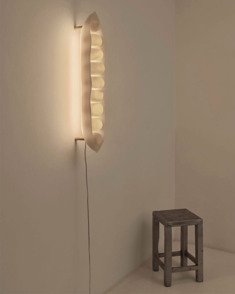 Entre as peças apresentadas na mostra Impermanência, a luminária Ervilha revela o olhar sensível da designer Bianca Barbato para a relação entre luz e matéria. Autodidata, a criadora construiu uma linguagem própria explorando reflexos, transparências e o encontro entre formas geométricas e orgânicas. Em seus projetos, materiais como madeira, resina e metal aparecem combinados em processos que misturam o artesanal e o industrial. O resultado são peças de presença delicada, nas quais rigor construtivo e fluidez formal convivem com naturalidade.