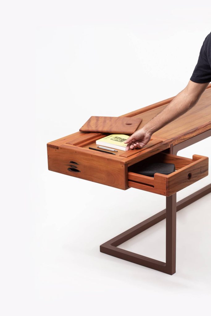 Formado pela UFRJ, com especialização no Dublin Institute of Technology, Dimitrih circulou por estúdios no Brasil e na Irlanda, explorando linguagens e elementos. Mas foi na madeira reaproveitada que encontrou sua voz. Um material vivo, que carrega marcas do tempo e histórias – e que ele ressignifica em criações que dialogam com aço inox, latão e couro, sempre guiadas por detalhes minuciosos e um acabamento refinado.