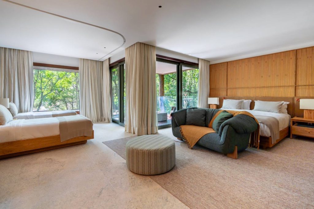 Inserido dentro do Instituto Inhotim, o Hotel Clara carrega a essência artística do maior museu a céu aberto do mundo. O projeto, sonhado por Freusa Zechmeister e finalizado pela dupla Joana Magalhães e Sofia Lobato, do escritório Hemisfério Arquitetura (@hemisferio.arq), permite experenciar o luxo silencioso do essencial, em 46 bangalôs. Nos interiores, Marina Linhares compôs ambientes que acolhem e aquietam: móveis de madeira com alma brasileira, pedras-sabão vindas de São João del Rei, tecidos que carregam o cheiro do campo.