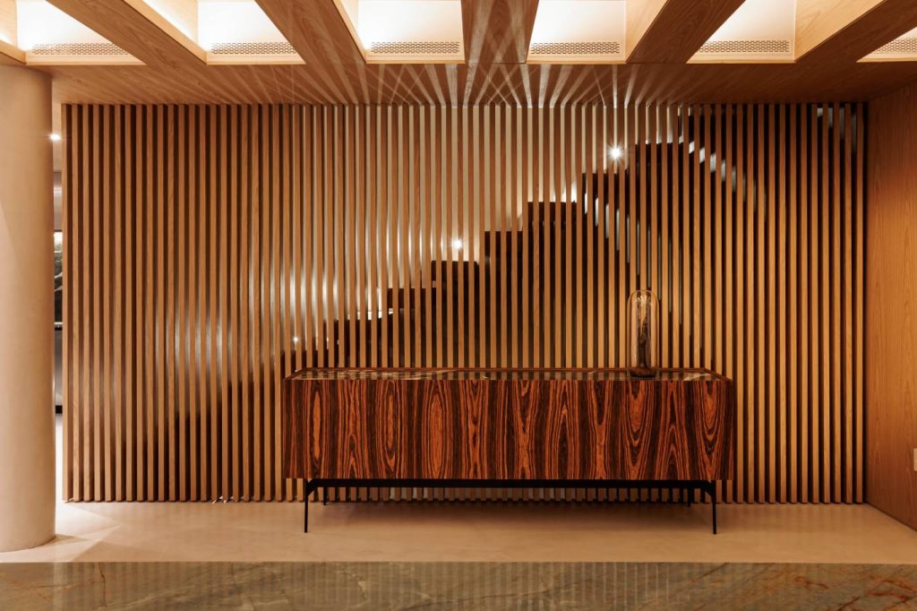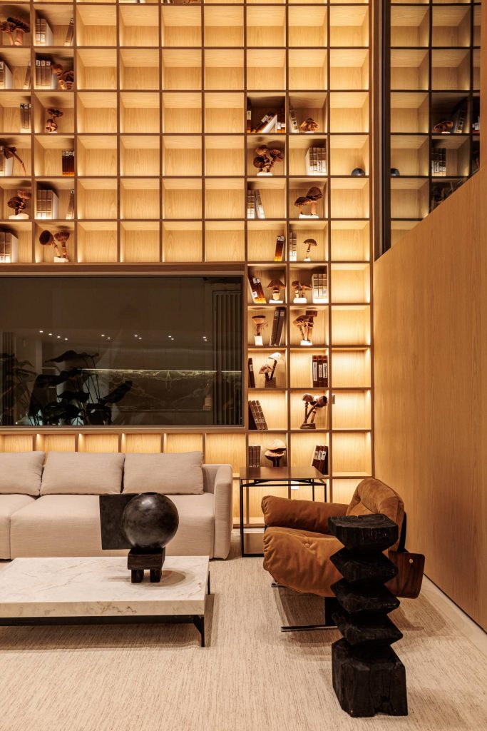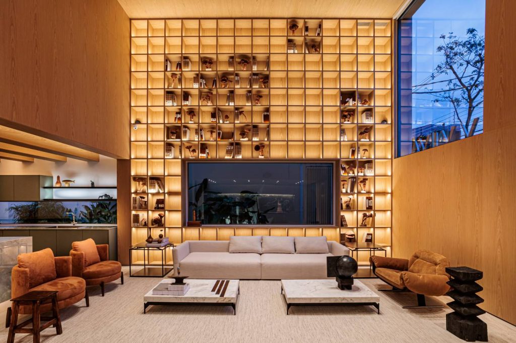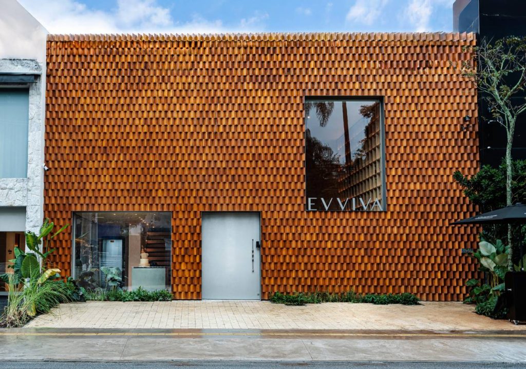 Assinado pelo escritório BC Arch (@bcarquitetos), o projeto arquitetônico aposta em uma abordagem contemporânea, na qual arquitetura e mobiliário se integram de maneira orgânica. A fachada, executada manualmente de madeira, interpreta o monograma da marca a partir da repetição dos três “V”, criando um elemento de identidade que se estende para o interior. Entre os destaques, está um estúdio residencial de 43 m² que sintetiza a proposta da marca para a vida urbana, com soluções compactas e integradas.