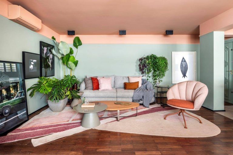 As cores verde, laranja e rosa dominam a paleta neste apartamento de 91 m²