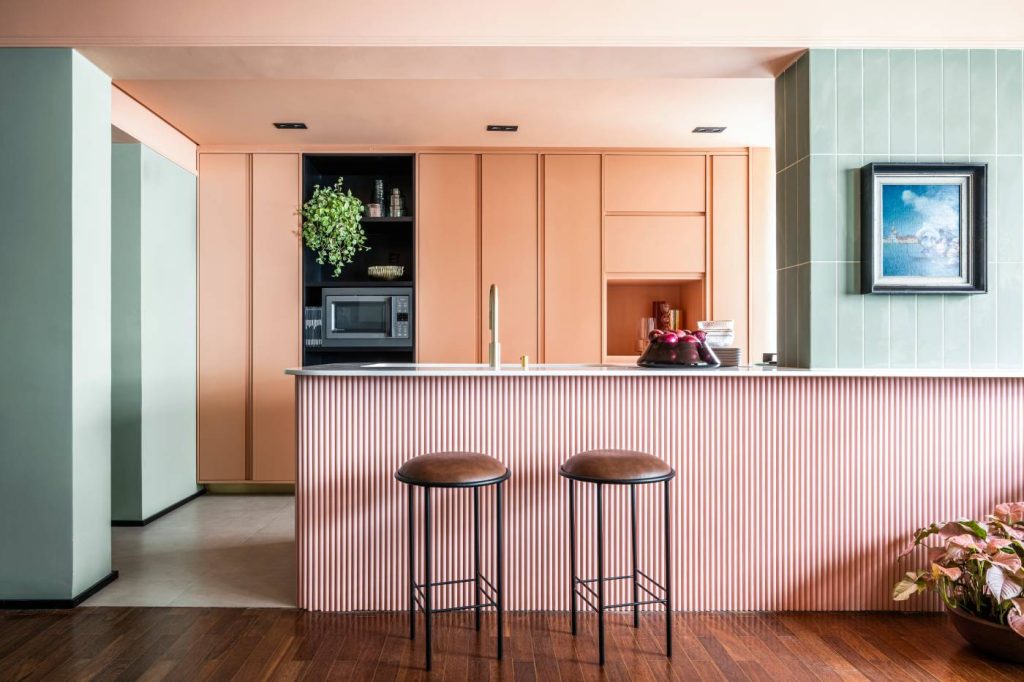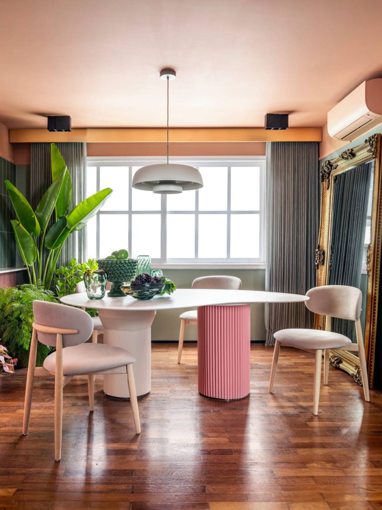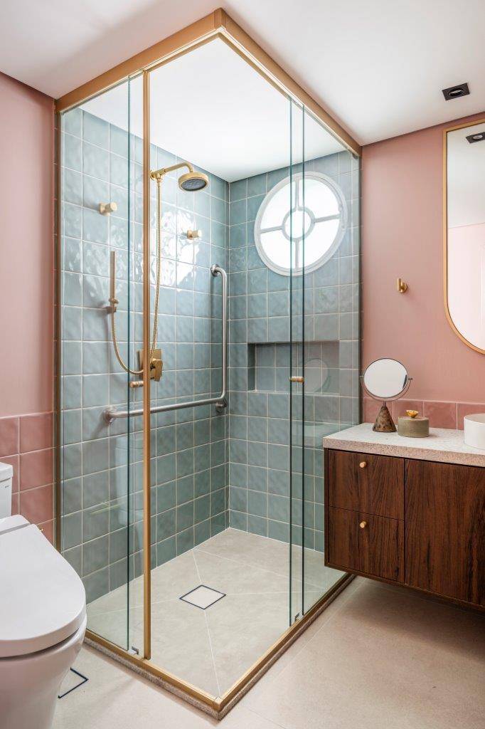 Outra tonalidade marcante, que não fica de lado, é o rosa, presente na ilha da cozinha, nas marcenarias, no banheiro e no quarto principal. Segundo o profissional, quando associada ao laranja, a cor transmite otimismo e positividade. “No banheiro, os revestimentos rosa e esmaltados, em formatos 15 x 15 cm, são uma lembrança dos antigos cômodos azulejados”, declara.