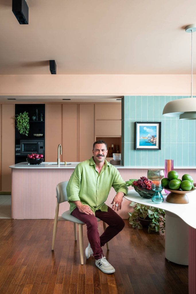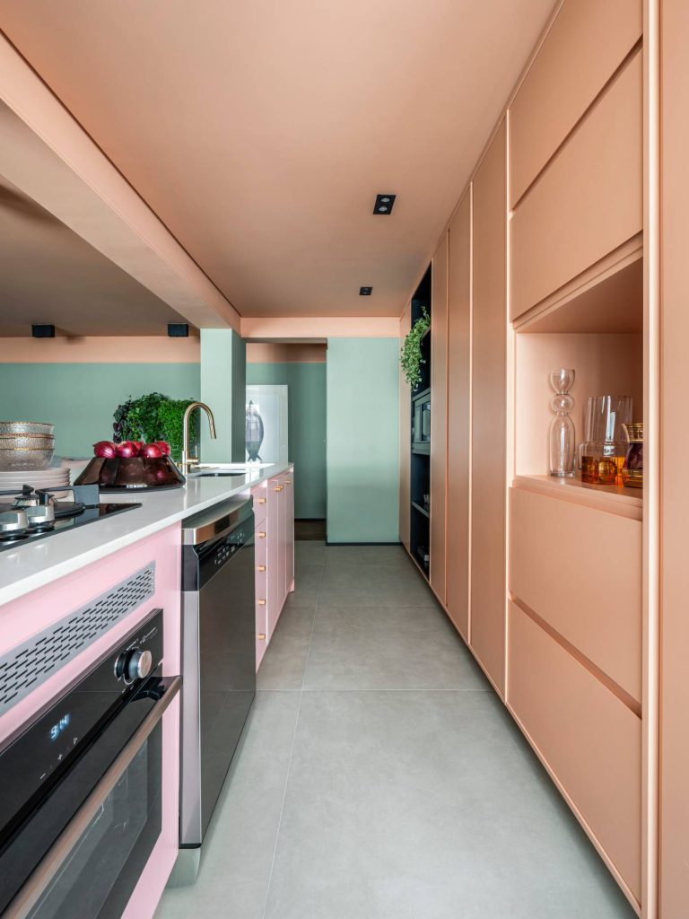 O arquiteto Ricardo Abreu deu ares de “caixa de cores” para a cozinha, onde verde, rosa e laranja convivem em ótima harmonia | Foto: Renato Navarro/Divulgação
