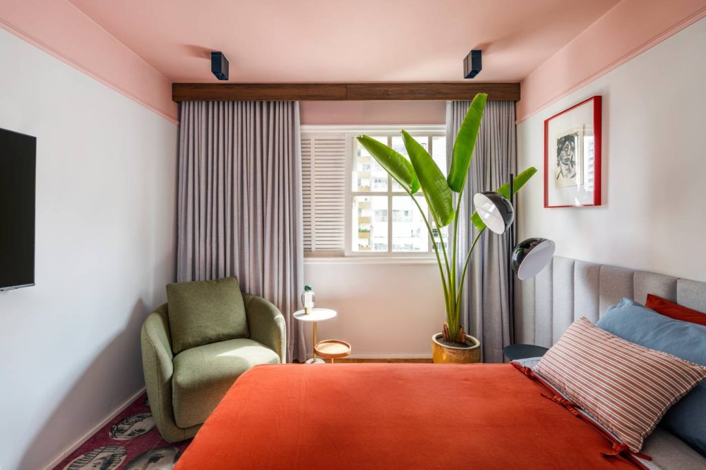 No quarto principal, o tom de rosa foi usado da mesma forma que o laranja da sala de estar, ocupando teto e uma parte da parede, mas, aqui, assume todo o protagonismo. A planta ravenala traz a natureza para o interior | Foto: Renato Navarro/Divulgação