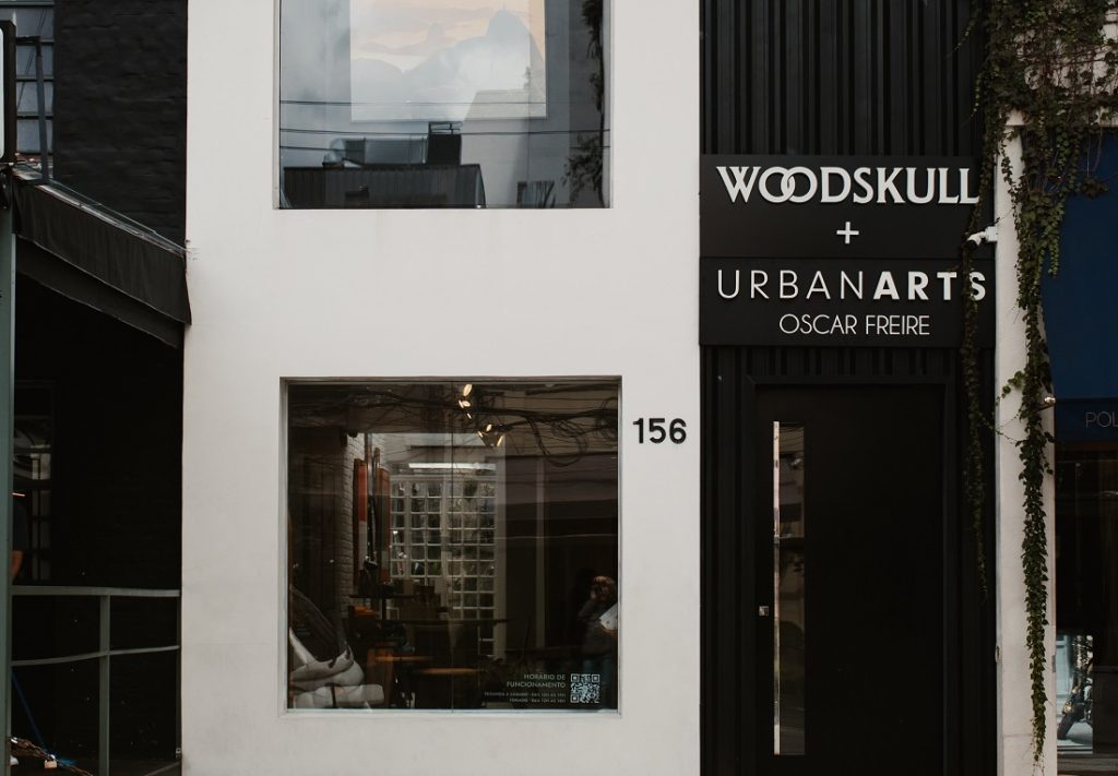 Na fachada discreta da Rua Oscar Freire, o letreiro sinaliza a união entre WoodSkull e Urban Arts, antecipando a proposta do espaço que combina mobiliário autoral e arte em um mesmo endereço | Foto: Divulgação